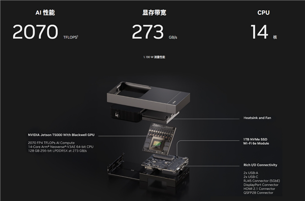 Jetson AGX Thor开发者套件起售价为3499美元,Jetson Thor可提供高达2070 FP4 TFLOPS的AI计算和128 GB的内存,